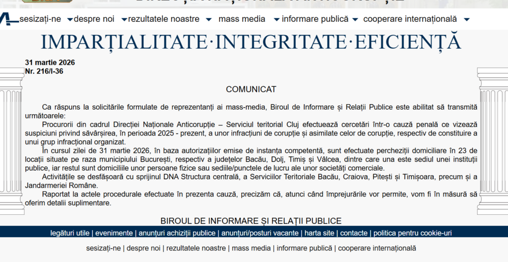 În cursul zilei de 31 martie 2026, în baza autorizațiilor emise de instanța competentă, sunt efectuate percheziții domiciliare în 23 de locații situate pe raza municipiului București, respectiv a județelor Bacău, Dolj, Timiș și Vâlcea, dintre care una este sediul unei instituții publice, iar restul sunt domiciliile unor persoane fizice sau sediile/punctele de lucru ale unor societăți comerciale.