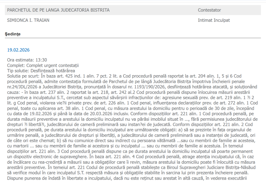 „Admite contestaţia formulată de Parchetul de pe lângă Judecătoria Bistriţa împotriva Încheierii penale nr.24/JDL/2026 a Judecătoriei Bistriţa, pronunţată în dosarul nr. 1193/190/2026, desfiinţează hotărârea atacată, şi soluţionând cauza: – dispune înlocuirea măsurii arestării preventive a inculpatului S.T., cercetat sub aspectul săvârşirii infracţiunilor de: agresiune sexuală, violarea vieții private, influenţarea declaraţiilor, toate cu aplicarea art. 38 alin. 1 Cod penal, cu măsura arestului la domiciliu pentru o perioadă de 30 de zile, începând cu data de 19.02.2026 şi până la data de 20.03.2026 inclusiv.