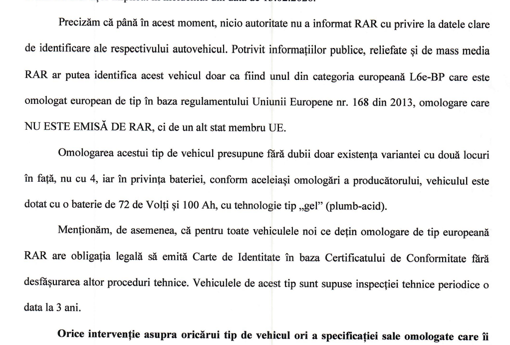 „Mențiune: RAR a emis CIV, așa cum se specifică în comunicat pentru modelul comercial ARORA S2, modelul la care face referire mass-media. Registrul Auto Român a pus la dispoziţia Corpului de Control al Ministerului Transporturilor şi Infrastructurii toate documentele şi rapoartele pe care le deţine şi care fac referire la cazul cvadriciclului uşor implicat în incidentul din data de 13.02.2026. Precizăm că până în acest moment, nicio autoritate nu a informat RAR cu privire la datele clare de identificare ale respectivului autovehicul. Potrivit informaţiilor publice, reliefate şi de mass media RAR ar putea identifica acest vehicul doar ca fiind unul din categoria europeană L6e-BP care este omologat european de tip în baza regulamentului Uniunii Europene nr. 168 din 2013, omologare care NU ESTE EMISĂ DE RAR, ci de un alt stat membru UE”, precizează RAR.