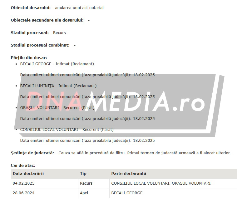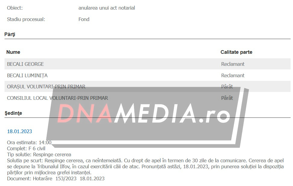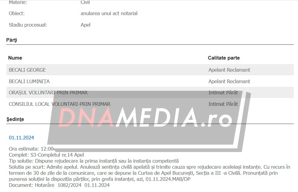 La finele anului trecut, Gigi Becali și soția acestuia au obținut rejudecarea. „Dispune rejudecare la prima instanţă sau la instanţa competentă. Solutia pe scurt: Admite apelul. Anulează sentinţa civilă apelată şi trimite cauza spre rejudecare aceleiaşi instanţe. Cu recurs în termen de 30 de zile de la comunicare, care se depune la Curtea de Apel Bucureşti, Secţia a III -a Civilă. Pronunţată prin punerea soluţiei la dispoziţia părţilor, prin grefa instanţei”, au decis magistrații.