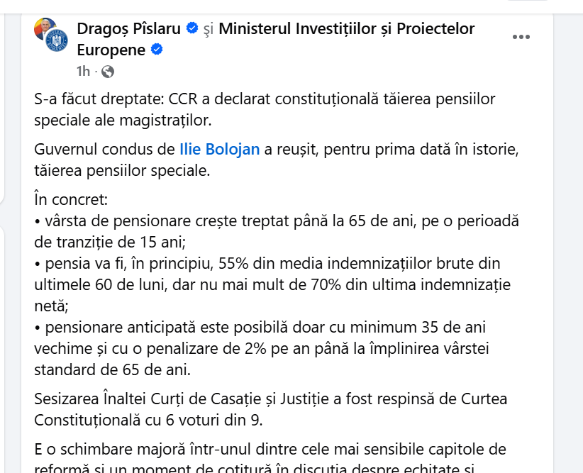 „S-a făcut dreptate: CCR a declarat constituțională tăierea pensiilor speciale ale magistraților.(…) Sesizarea Înaltei Curți de Casație și Justiție a fost respinsă de Curtea Constituțională cu 6 voturi din 9. E o schimbare majoră într-unul dintre cele mai sensibile capitole de reformă și un moment de cotitură în discuția despre echitate și sustenabilitate în sistemul de pensii din România. În orele următoare voi avea discuții cu oficialii europeni cu privire la această evoluție a aprobării legii de către CCR. Odată cu promulgarea din partea președintelui Nicușor Dan, vom putea în sfârșit demonstra îndeplinirea reformei asumate de România în cadrul PNRR.