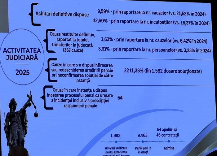 ”Dosarele restituite definitiv s-au redus la doar 1,63% din totalul trimiterilor în judecată, față de 6,42% în 2024. Infirmarea sau redeschiderea urmăririi penale a fost dispusă în doar 22 de cauze, adică 1,38% din totalul dosarelor soluționate. Aceste cifre nu sunt accidentale. Ele reflectă o filosofie de lucru pe care am impus-o în acești ani: dosare solide, probatoriu robust, acuzații care rezistă testului critic al instanțelor. Nu am căutat titluri de ziar, ci verdicte de condamnare”, explica Voineag.